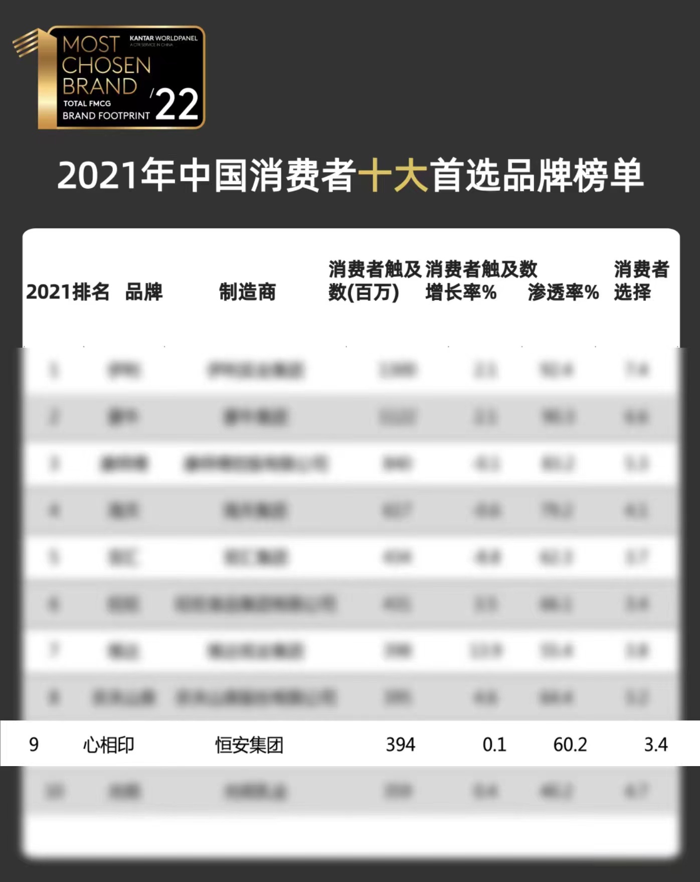 8月22日,2020年凯度世界各国品脾行迹中国有国行榜刷卡业主几年之选品脾颁奖典礼在南京召开,在凯度刷卡消耗额指数公式发布了《世界各国品脾行迹报告模板》中,心相印成功失败入选2023年“中国有国区刷卡业主第一选择前十品脾”之列。
